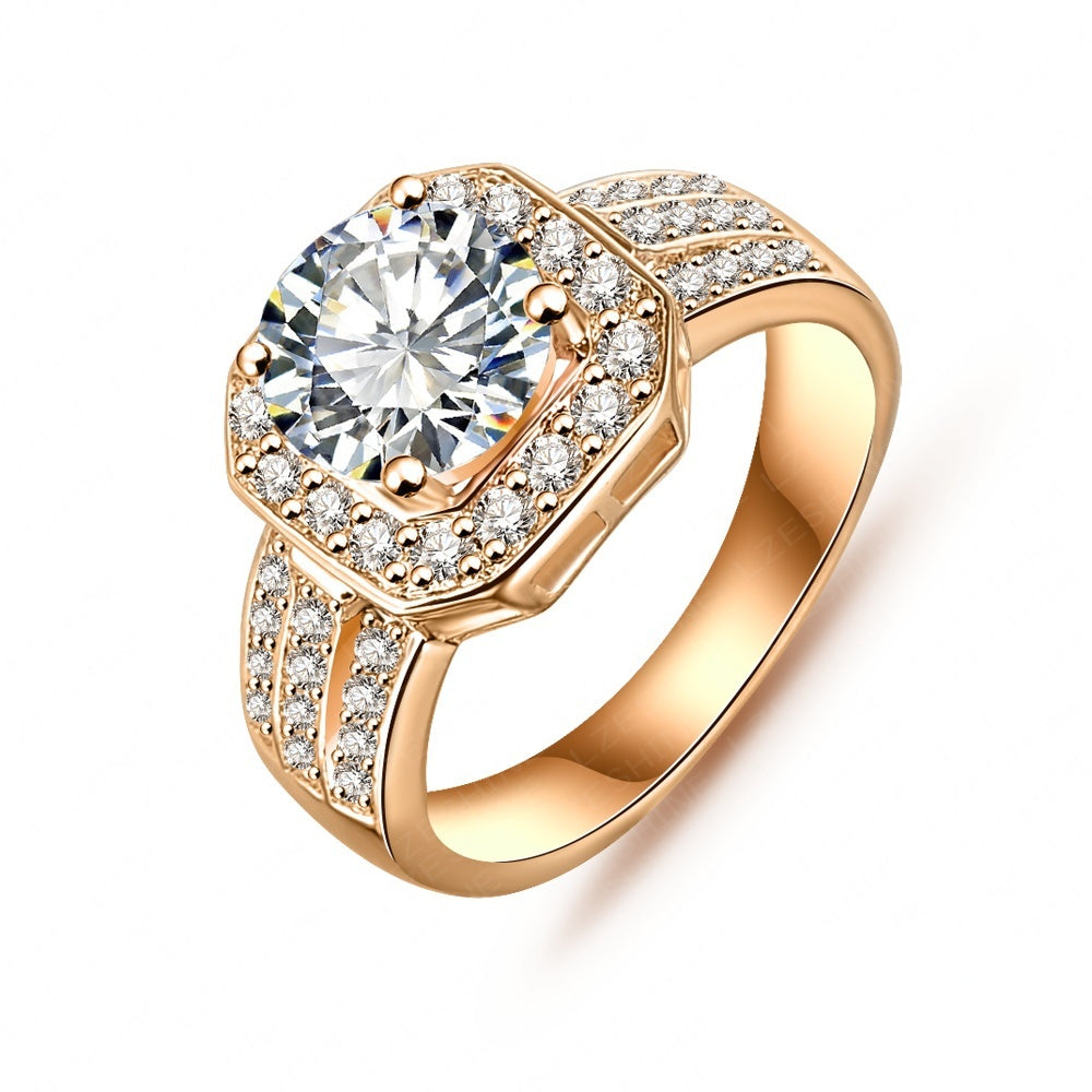 Stunning 18K yellow gold plated halo engagement ring featuring a brilliant round-cut cubic zirconia centerpiece set in an elegant octagonal halo. The geometric halo and pavé-set band are adorned with sparkling Austrian AAA crystals, creating a luxurious statement ring perfect for engagements and special occasions.