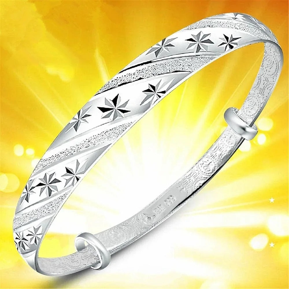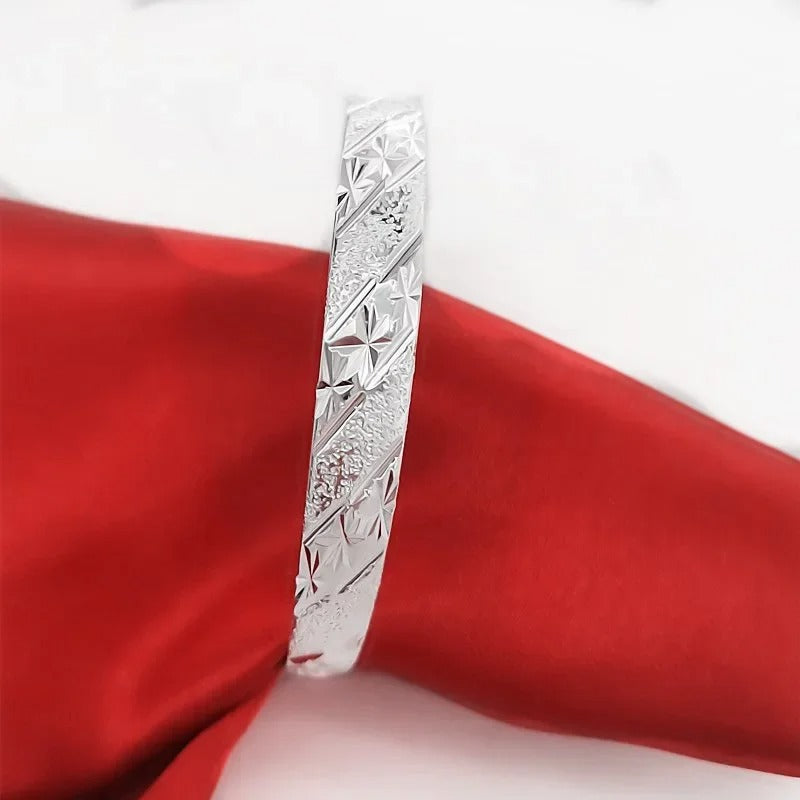 Premium sterling silver adjustable bangle featuring an intricate snowflake star design. Crafted from .925 sterling silver for lasting durability and timeless elegance.